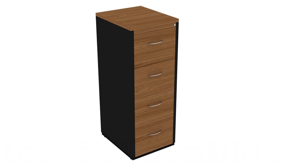 Archivero Vertical de 4 gavetas, fabricado en Melamina, con correderas de extensión completa y cerradura múltiple.
