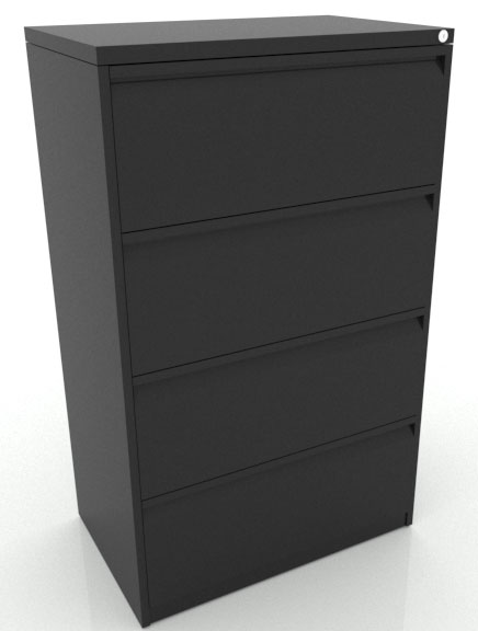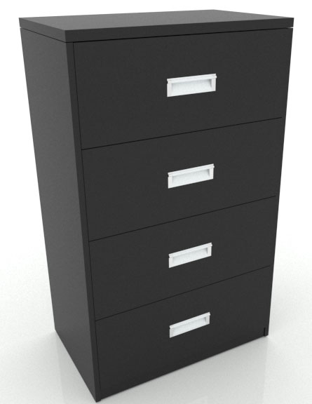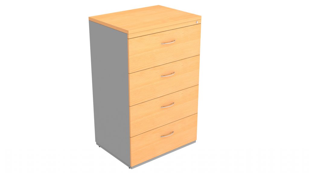 Archivero horizontal de 4 gavetas reforzado, fabricado en Melamina, con correderas de extensión completa y cerradura múltiple.