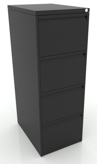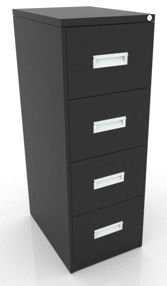 Archivero metálico vertical de 4 gavetas tamaño oficio, corredera de extensión móvil, nivelador de altura, jaladera embutida y cerradura. Calibre 22 y 24.
