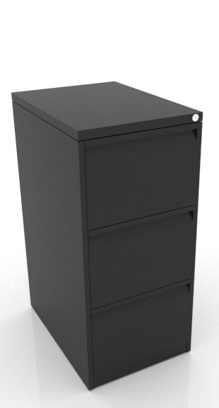 Archivero metálico vertical de 3 gavetas tamaño oficio, corredera de extensión móvil, nivelador de altura, jaladera embutida y cerradura. Calibre 22 y 24.