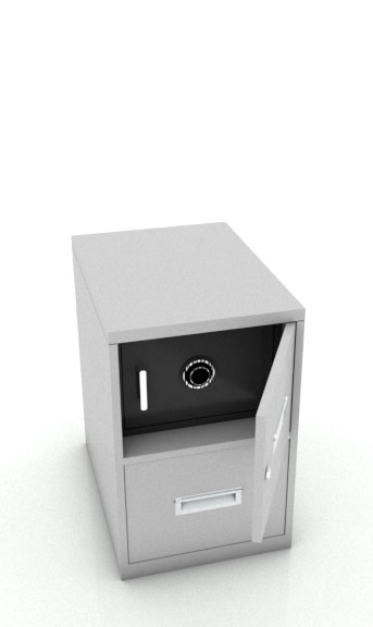 Archivero metálico vertical, 1 gaveta tamaño oficio y caja fuerte con marco inferior de tubular y resbalón metálico para soportar peso, corredera de extensión móvil, jaladera de aluminio y doble cerradura para puerta y cajones. Calibre 22.