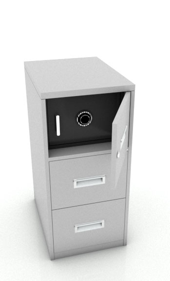 Archivero metálico vertical, 2 gavetas tamaño oficio y caja fuerte con marco inferior de tubular y resbalón metálico para soportar peso, corredera de extensión móvil, jaladera de aluminio y doble cerradura para puerta y cajones. Calibre 22.