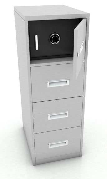 Archivero metálico vertical, 3 gavetas tamaño oficio y caja fuerte con marco inferior de tubular y resbalón metálico para soportar peso, corredera de extensión móvil, jaladera de aluminio y doble cerradura para puerta y cajones. Calibre 22.