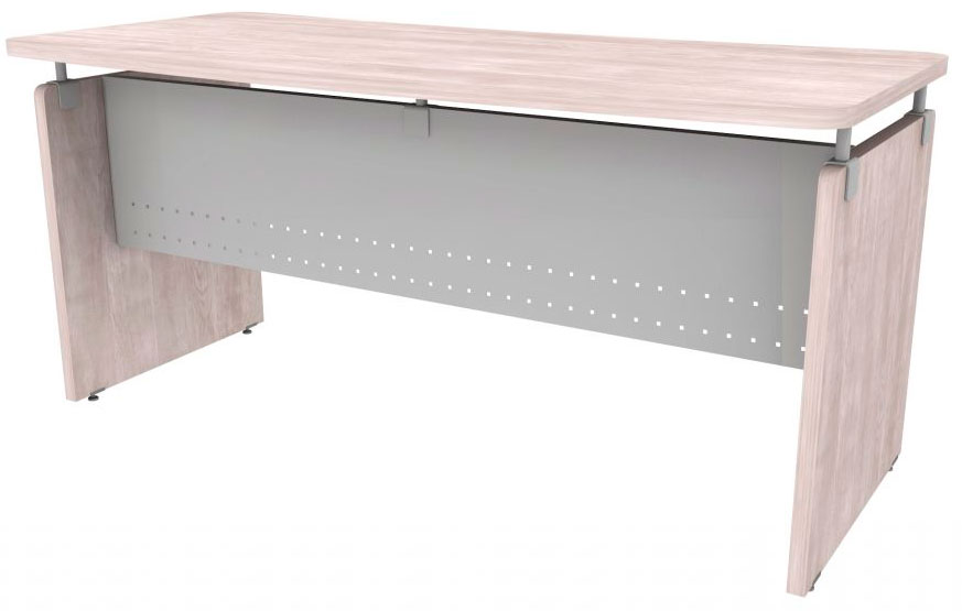 Escritorio secretarial con cubierta flotante, faldón metálico multiperforado.