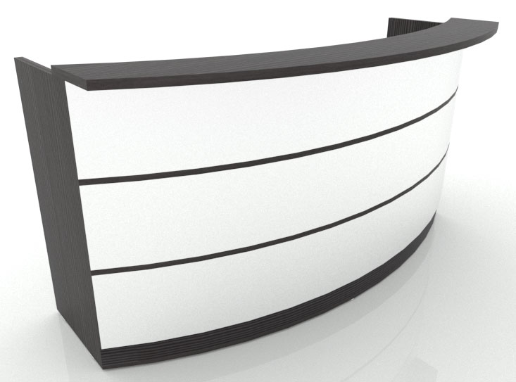 Recepción con frente curvo en tambor, fabricado en melamina de 28mm. Zoclo y entrecalles intermedias de color aluminio. *No incluye cajoneras